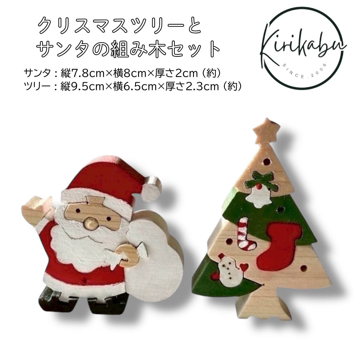 かわいいサンタの組み木とクリスマスツリーの組み木をセットにしました。